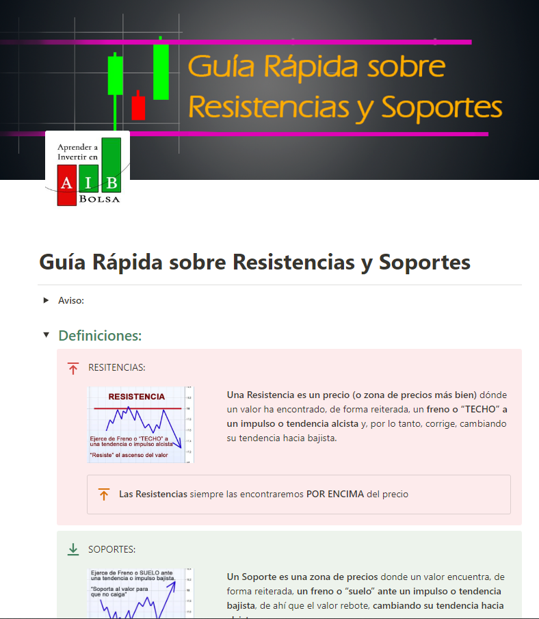 Esta guía rápida, sencilla y directa, que te enseñará las principales pistas para definir, localizar y operar con Resistencias y Soportes, pero te animo a que no te quedes aquí, hay mucho más que aprender sobre este importante Indicador Gráfico, esencial para cualquier inversor y uno de los primeros temas y pasos para tu independencia analítica.