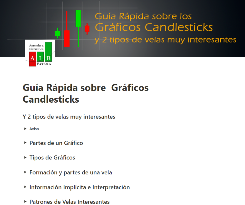 Con esta guía prentendo "tentarte" (así de claro) para que te animes con el Micro-Curso “Introducción a los Gráficos Candlesticks. Tres tipos de velas muy interesantes”, un Manual práctico y directo que te enseñará todo lo que tienes que saber sobre los Gráficos de Velas, su formación e información. Un manual perfecto para dar el primer paso en el aprendizaje del Análisis Técnico de Valores, con explicaciones ilustradas y gráficos reales de ejemplos.